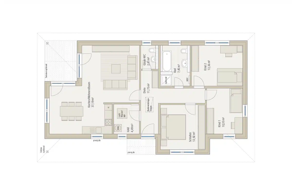 Wohnen/Essen mit offener Küche, Diele, HAR, Gäste-WC, 3 Schlafzimmer, Badezimmer