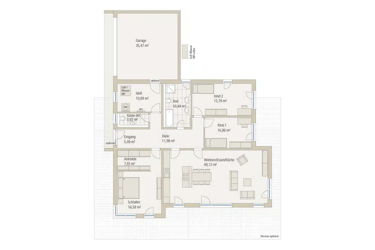 Wohnen/Essen mit offener Küche, Diele, HAR, Gäste-WC, 3 Schlafzimmer, Ankleide, Badezimmer, Garage mit direktem Zugang zum Haus